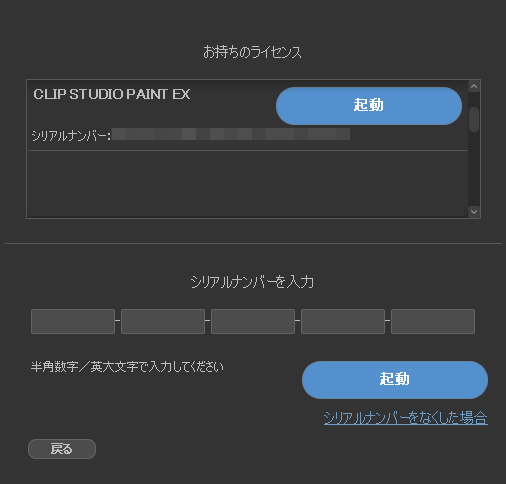 シリアルナンバーを入力して「起動」ボタンをクリックします。